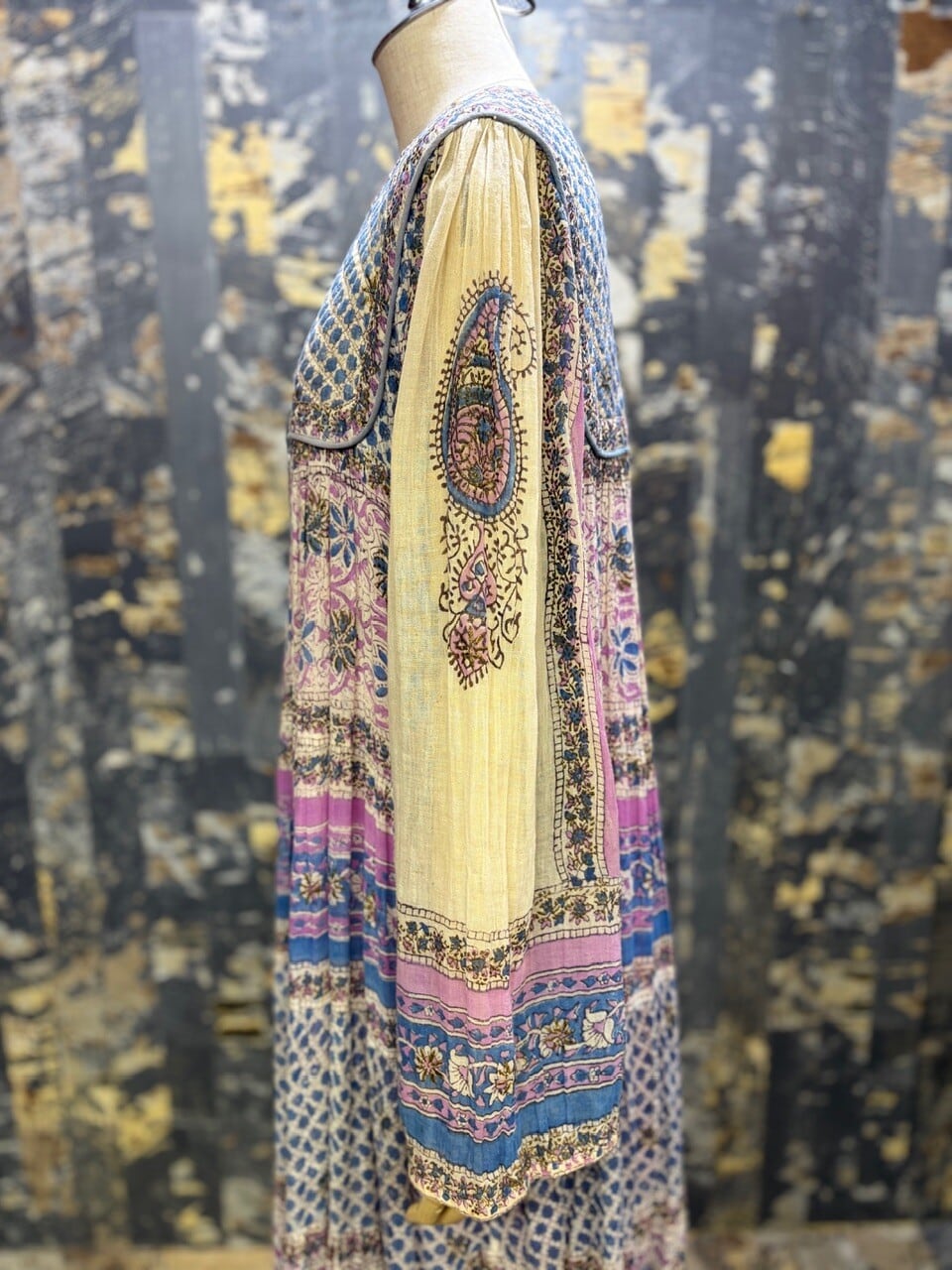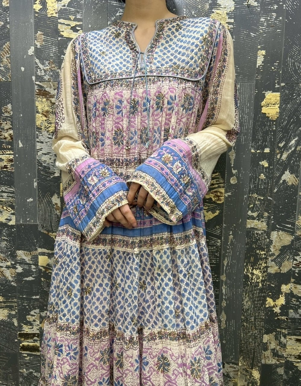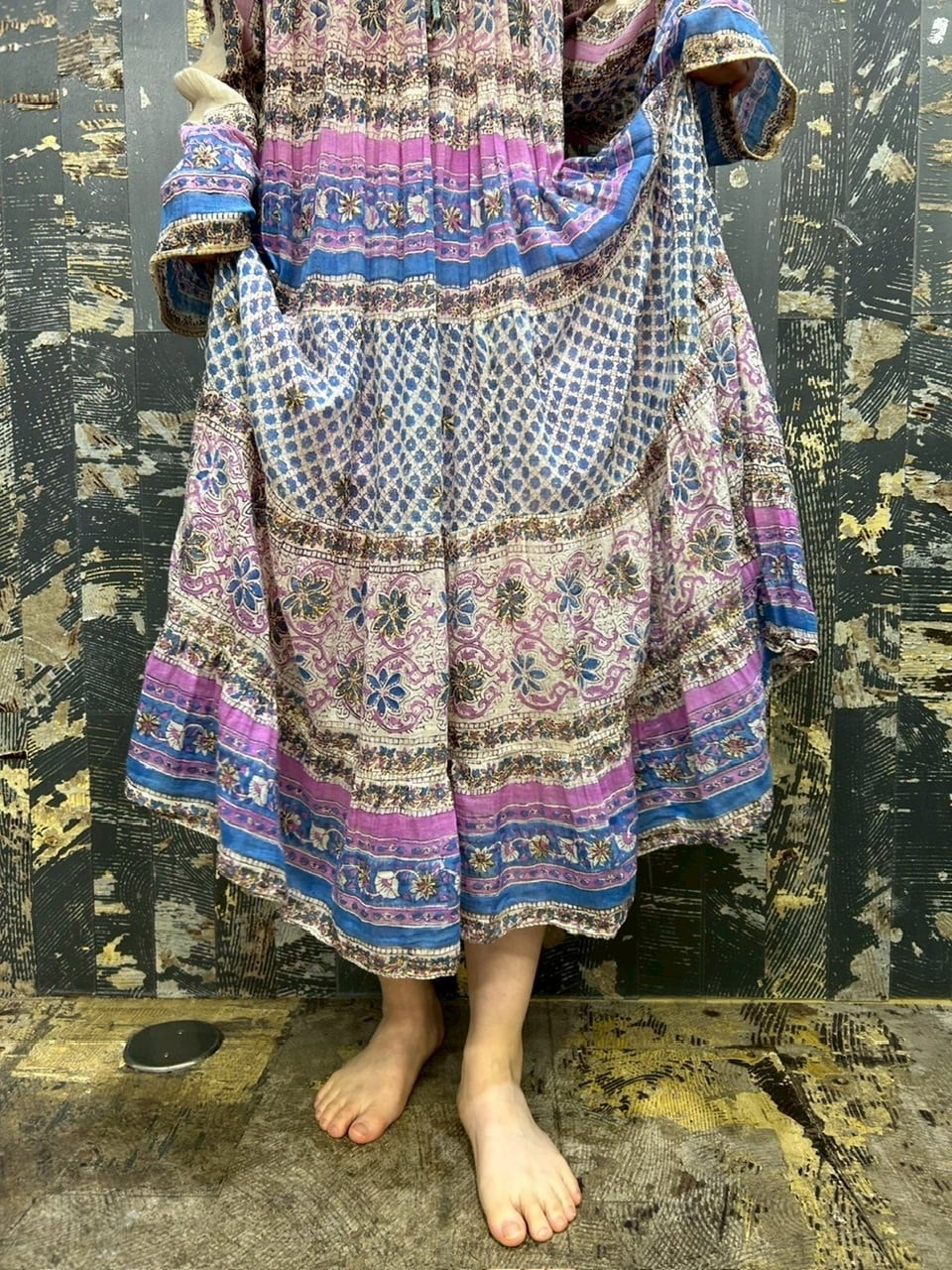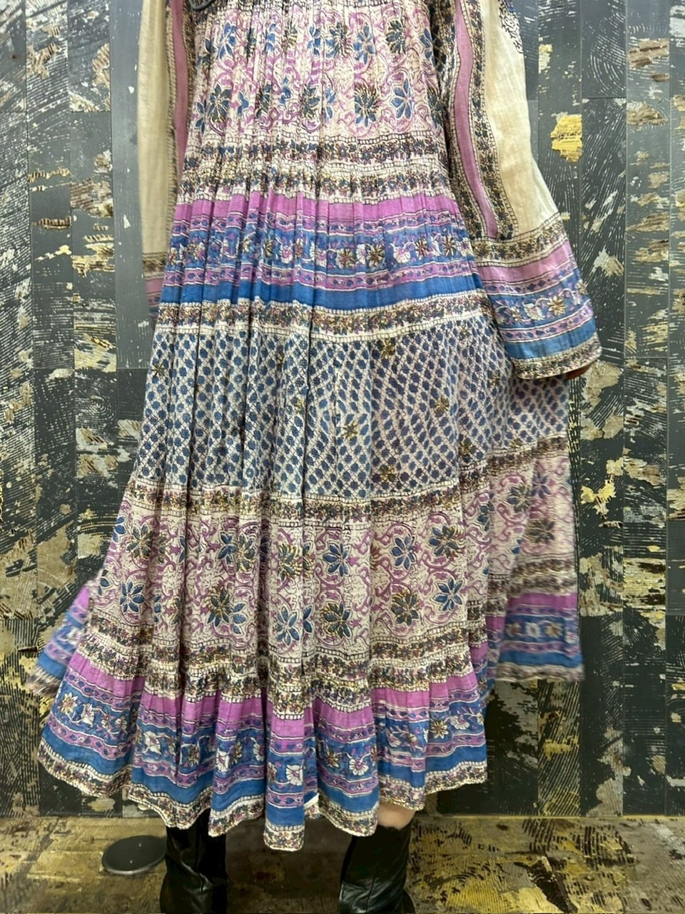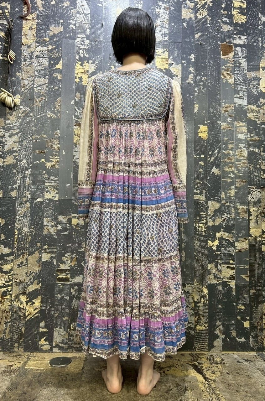 70s 80s インド綿ドレス ゴールドスタンプ