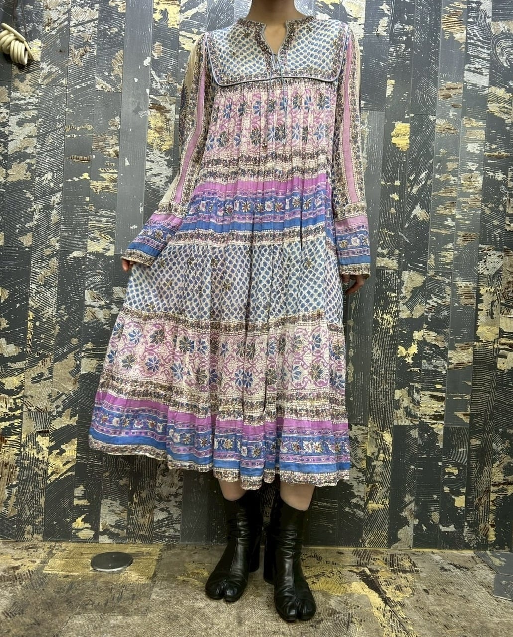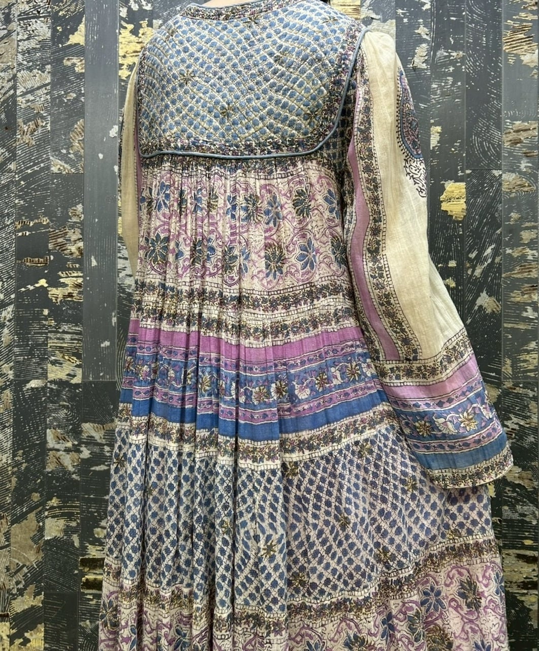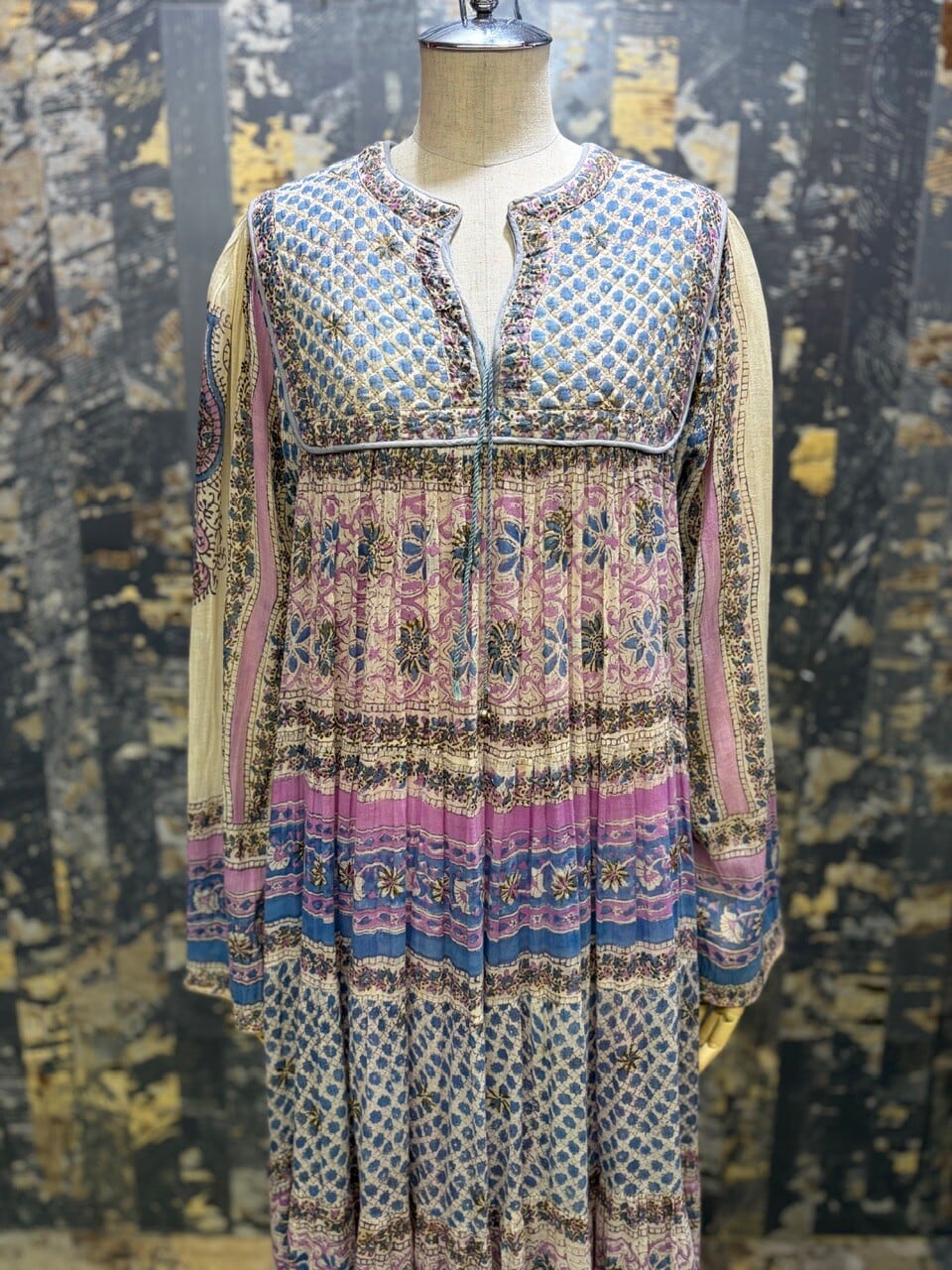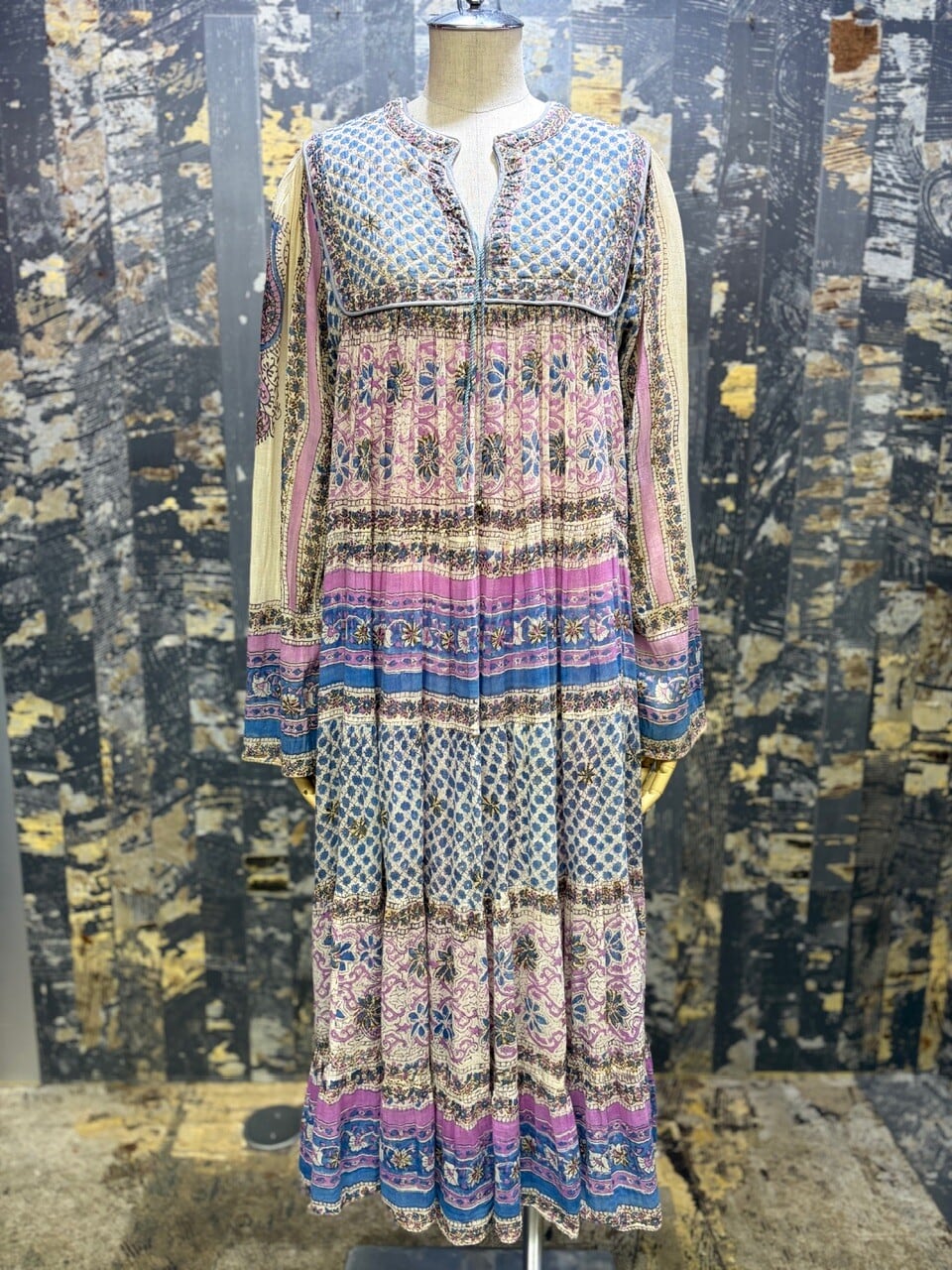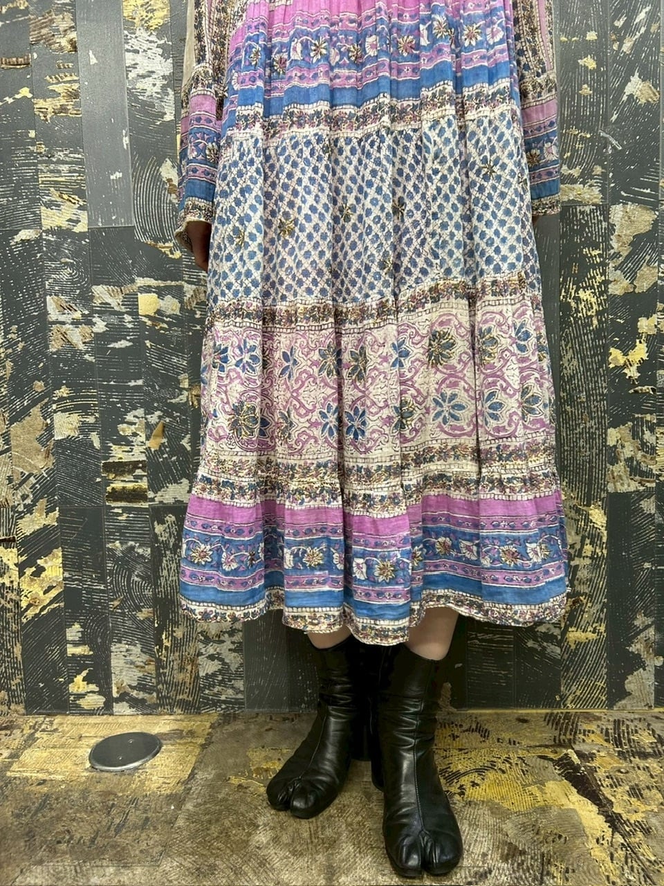 70s 80s インド綿ドレス ゴールドスタンプ