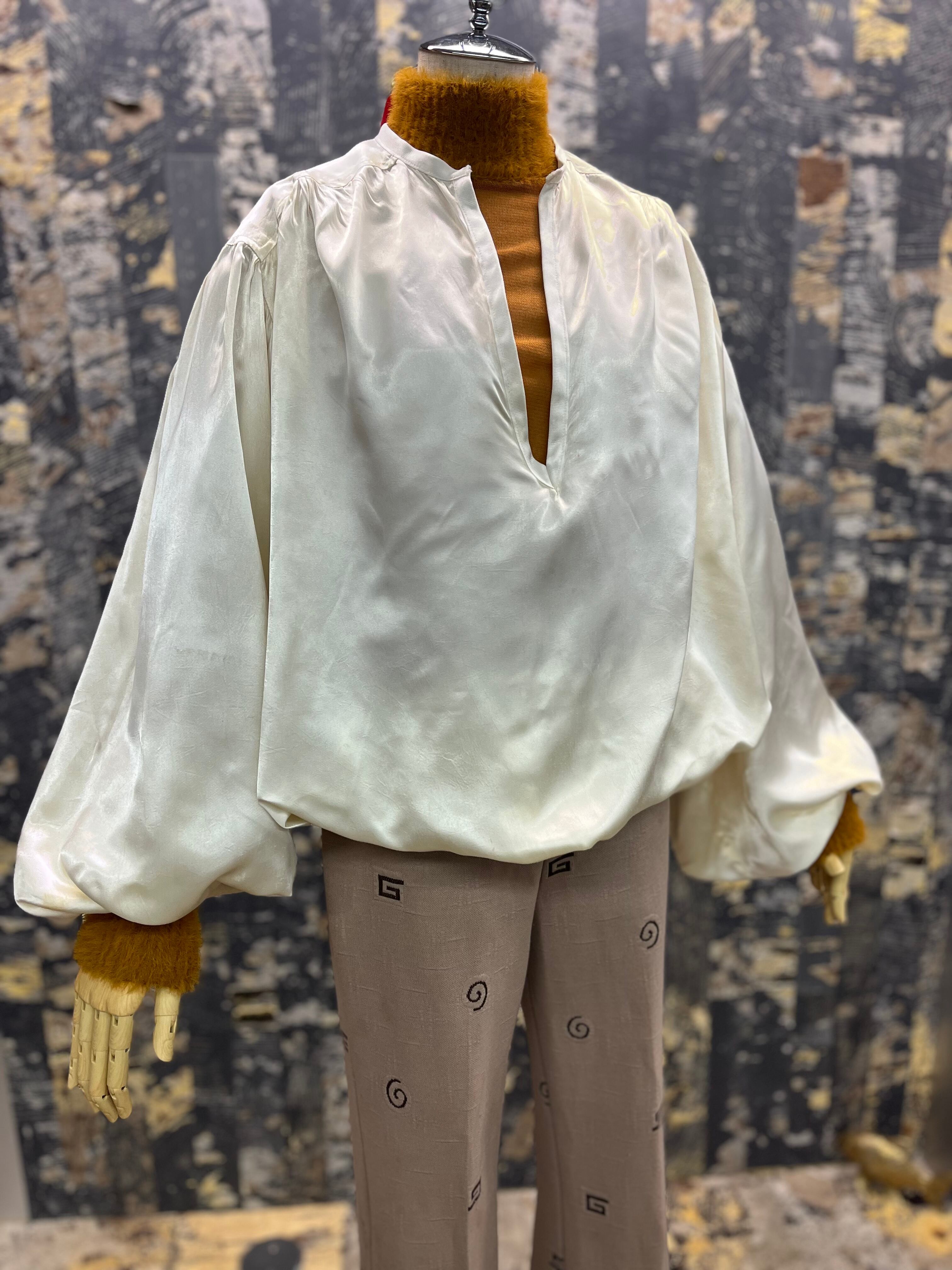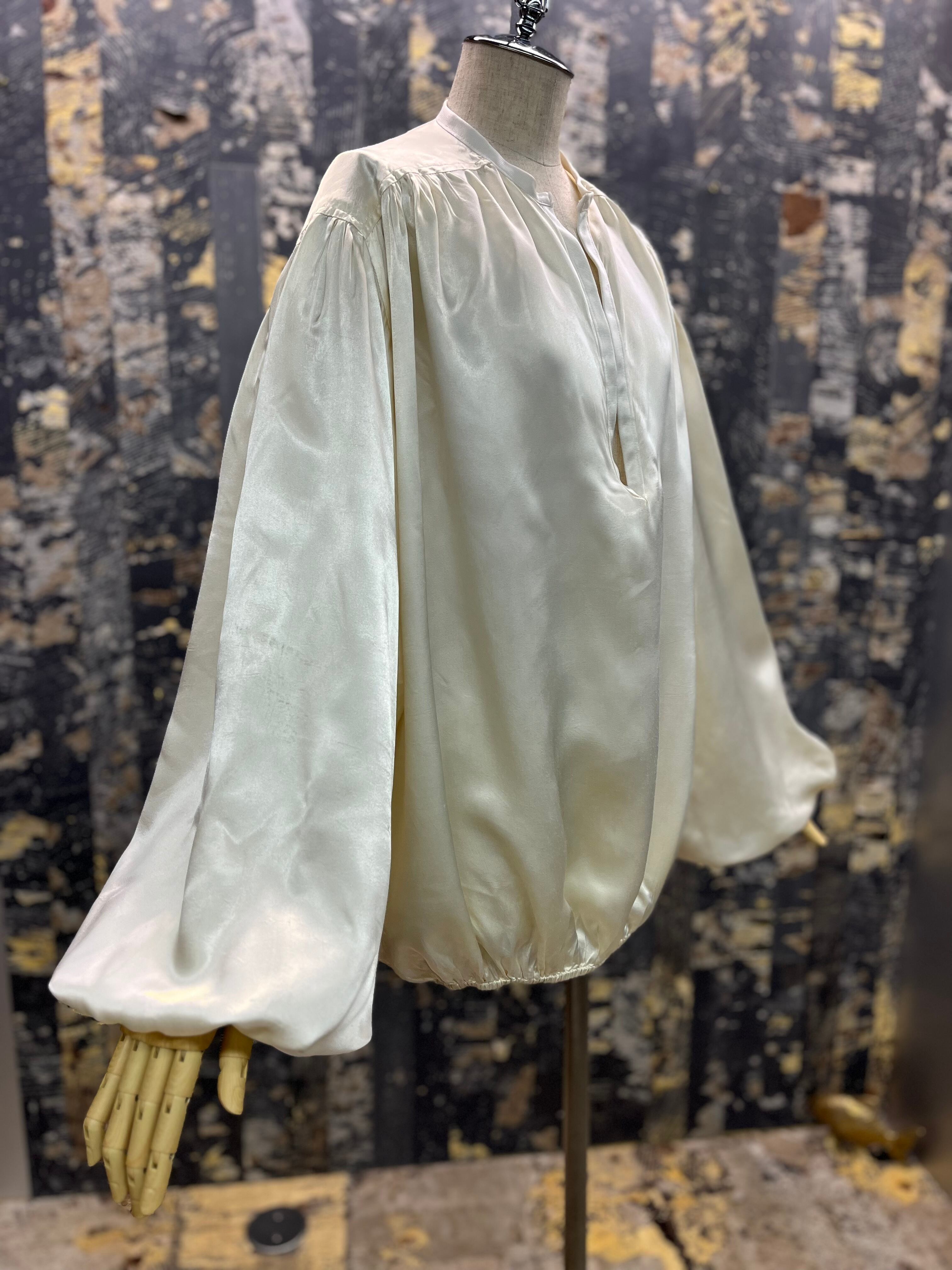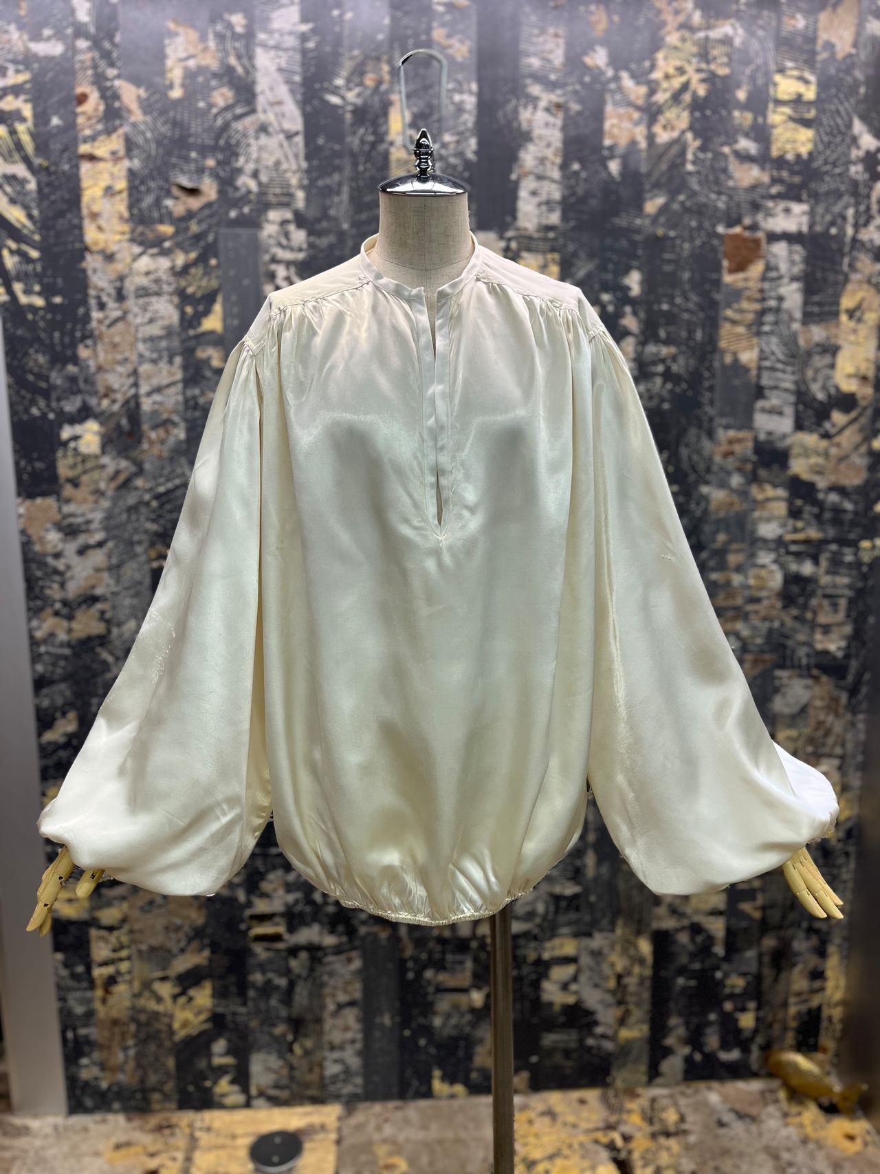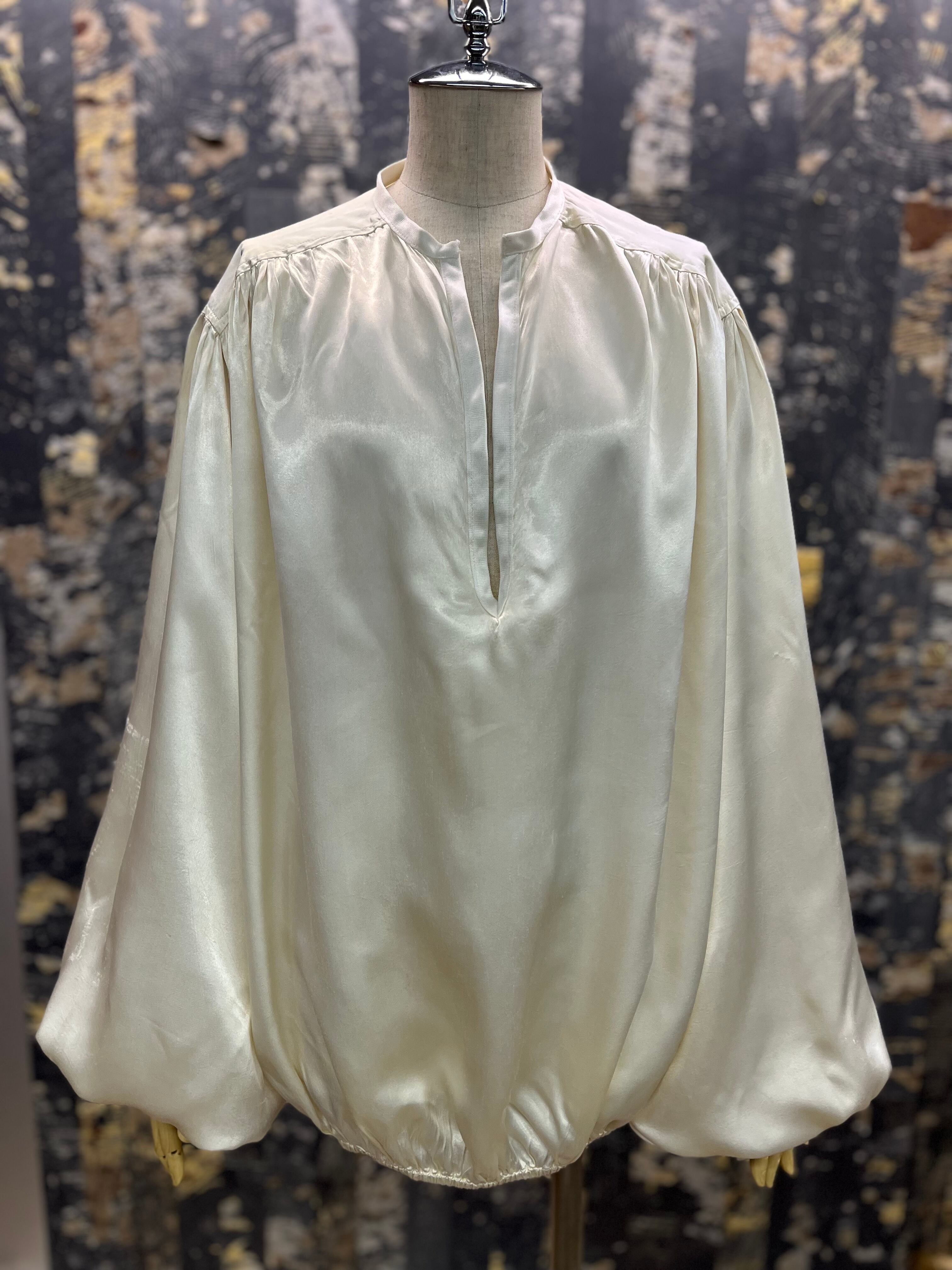 落ち感あるサテン生地にたっぷりボリュームのバルーンスリーブ。