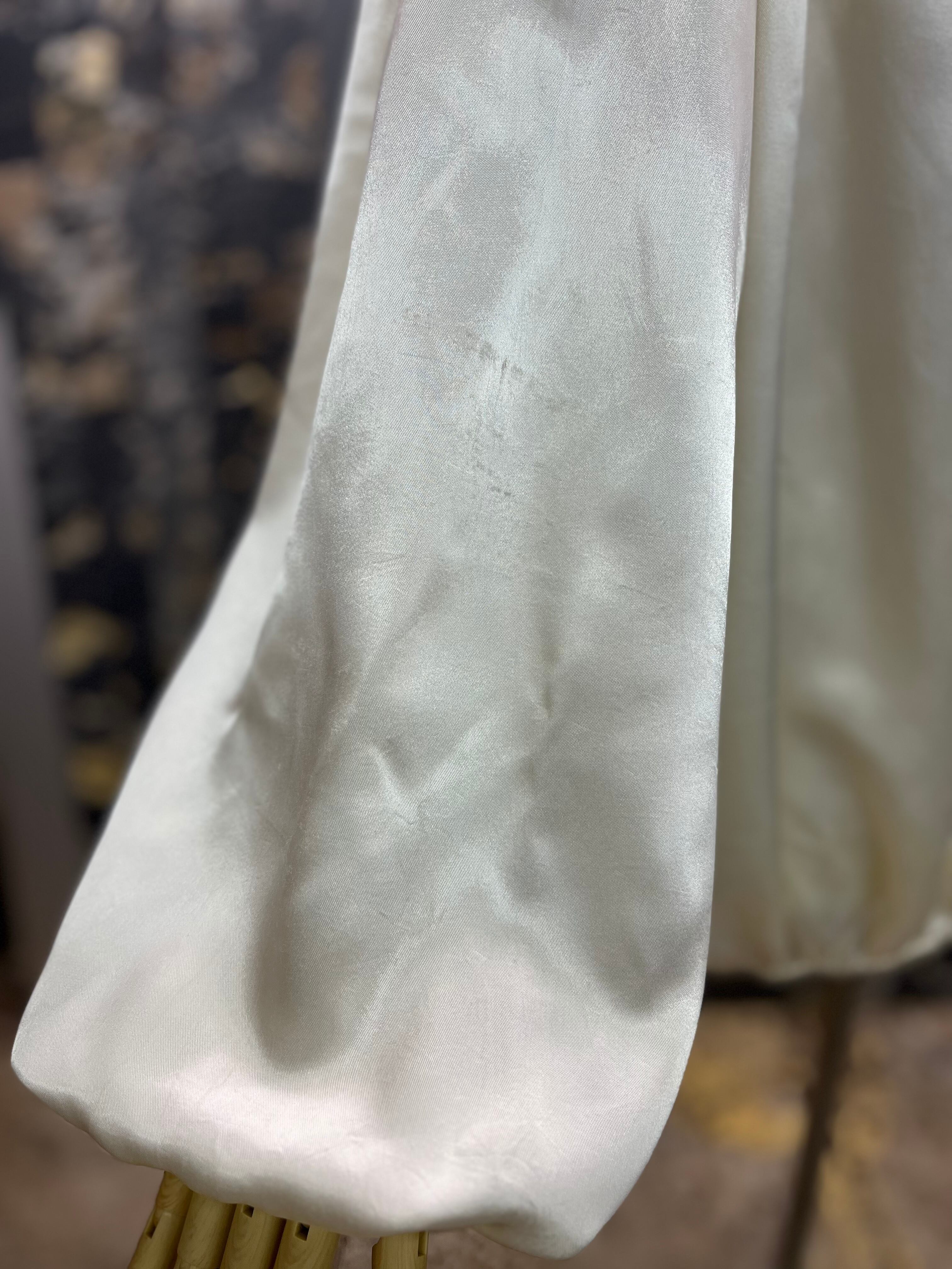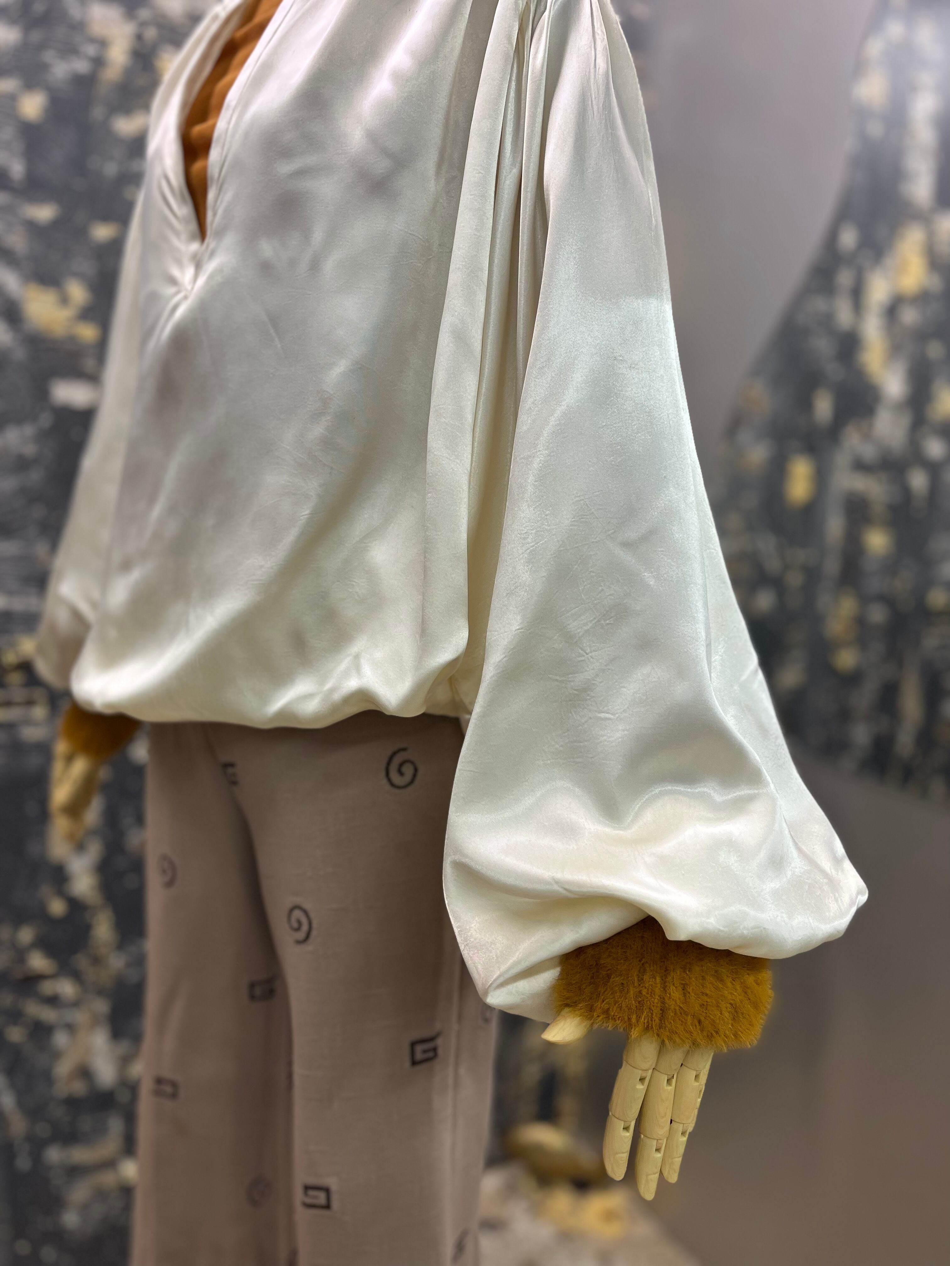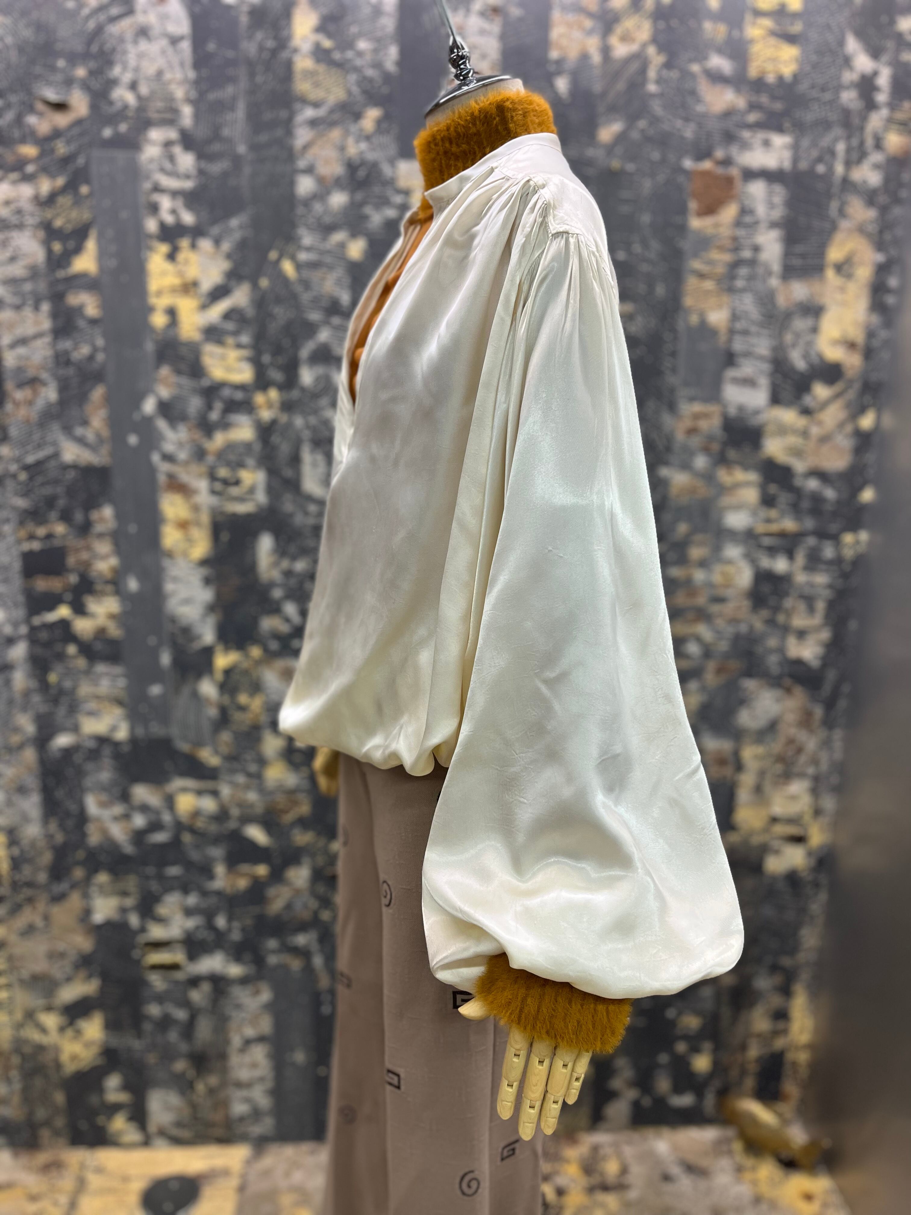 落ち感あるサテン生地にたっぷりボリュームのバルーンスリーブ。