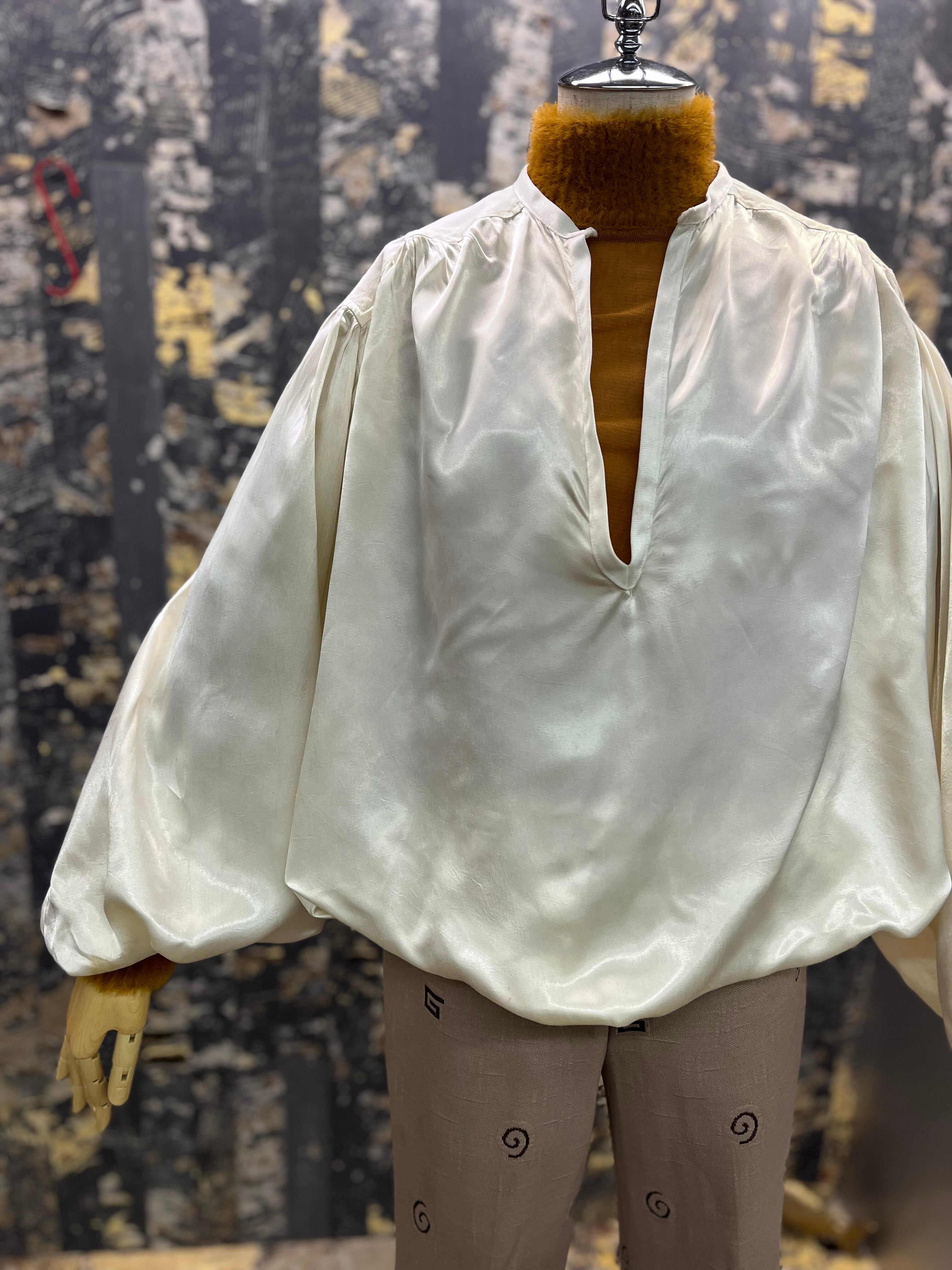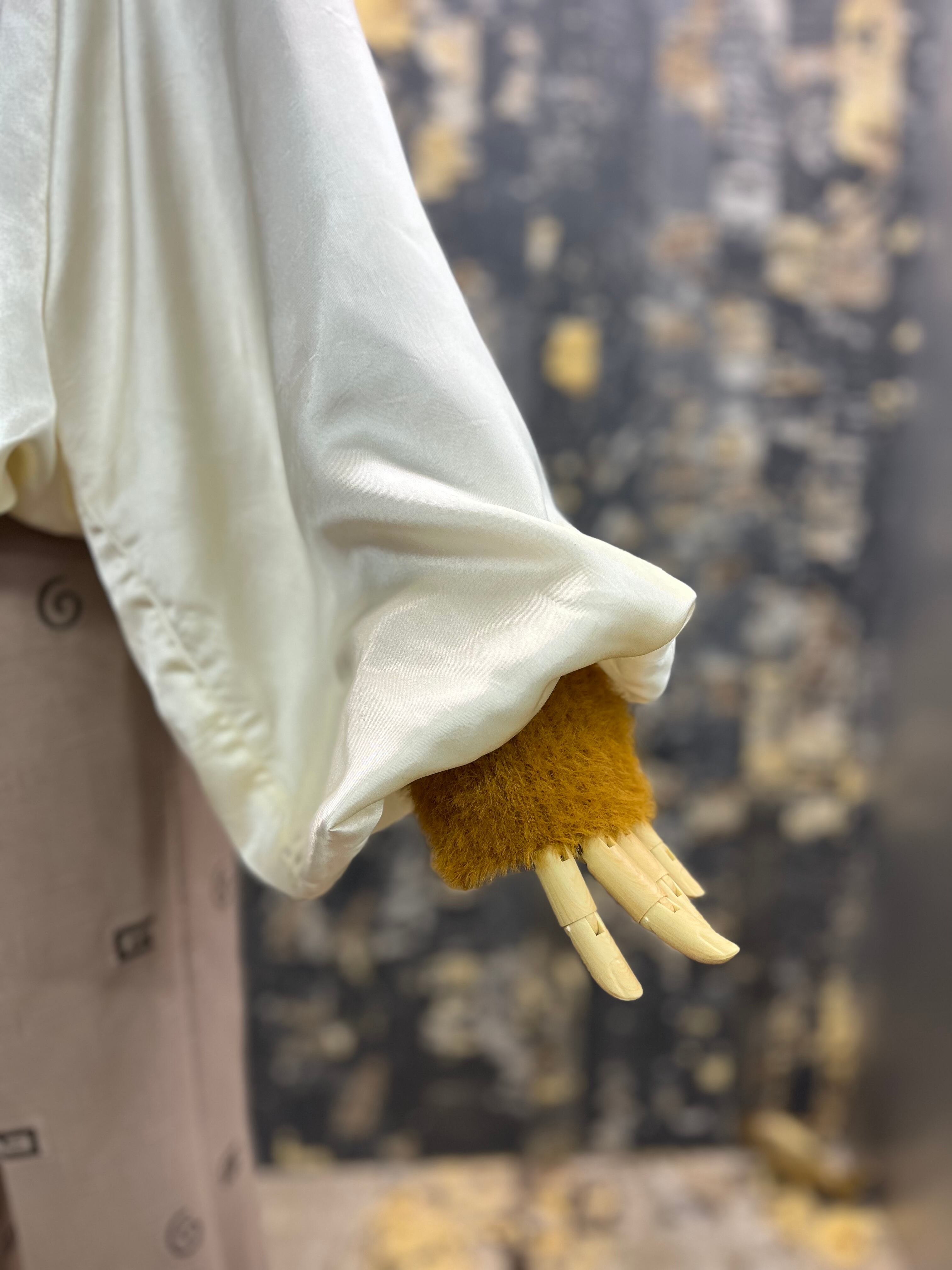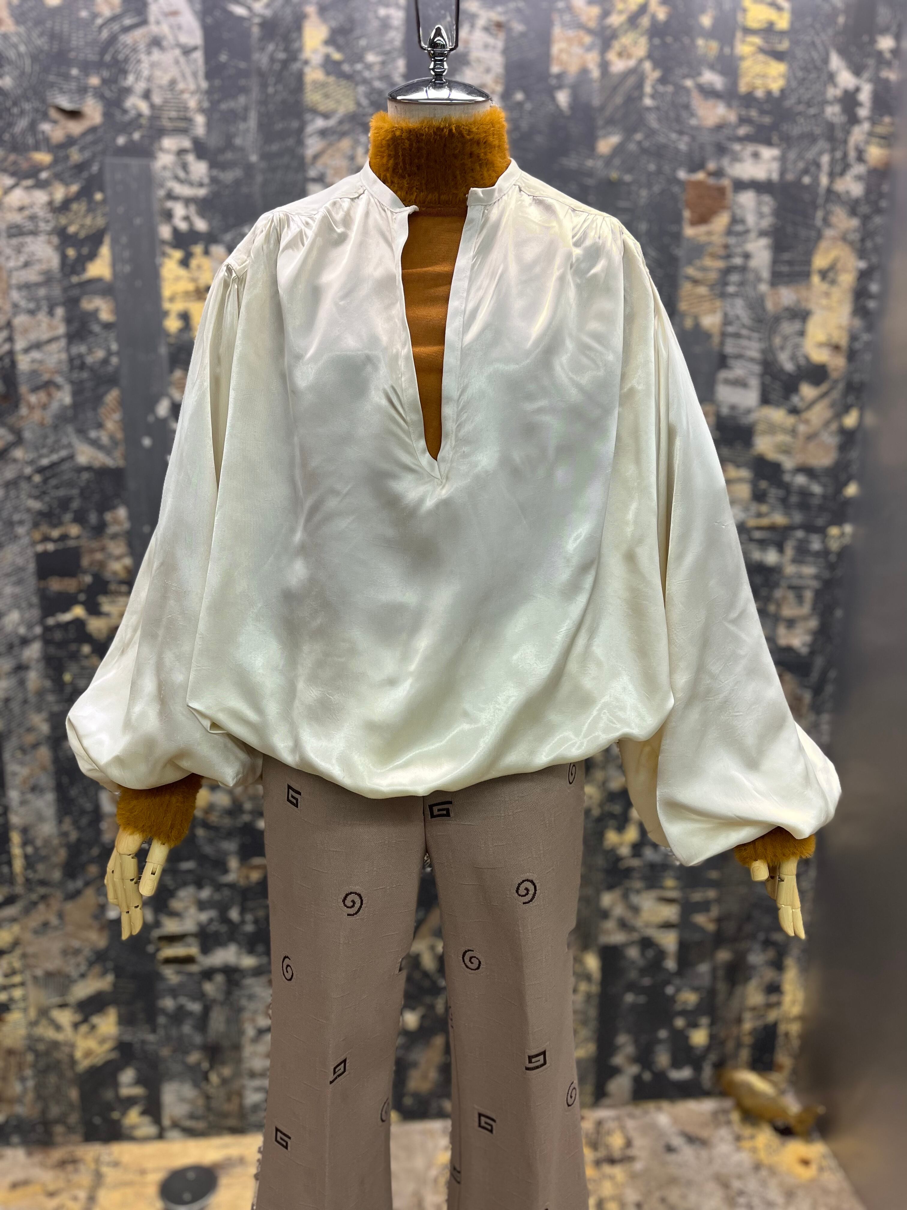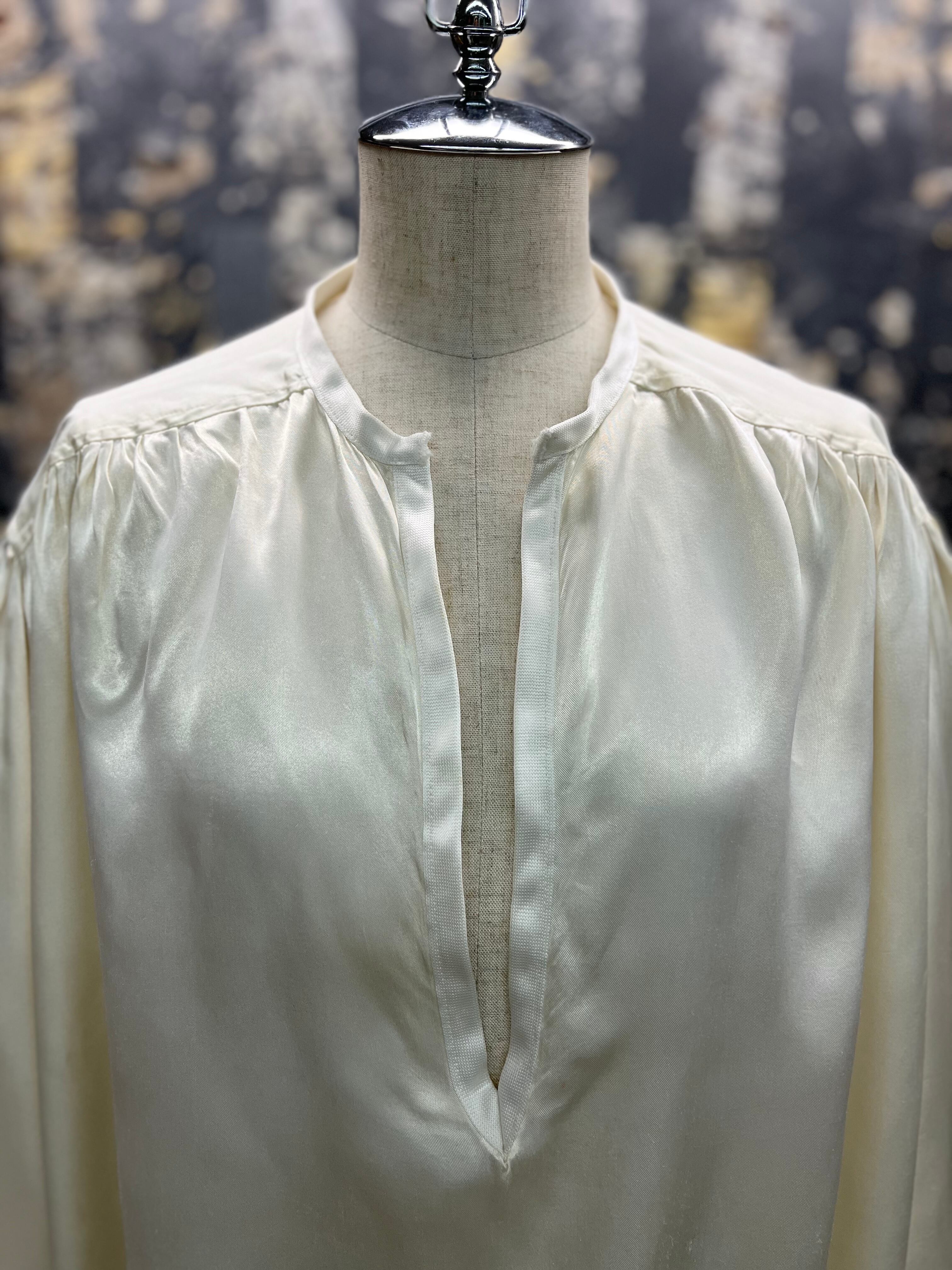 落ち感あるサテン生地にたっぷりボリュームのバルーンスリーブ。