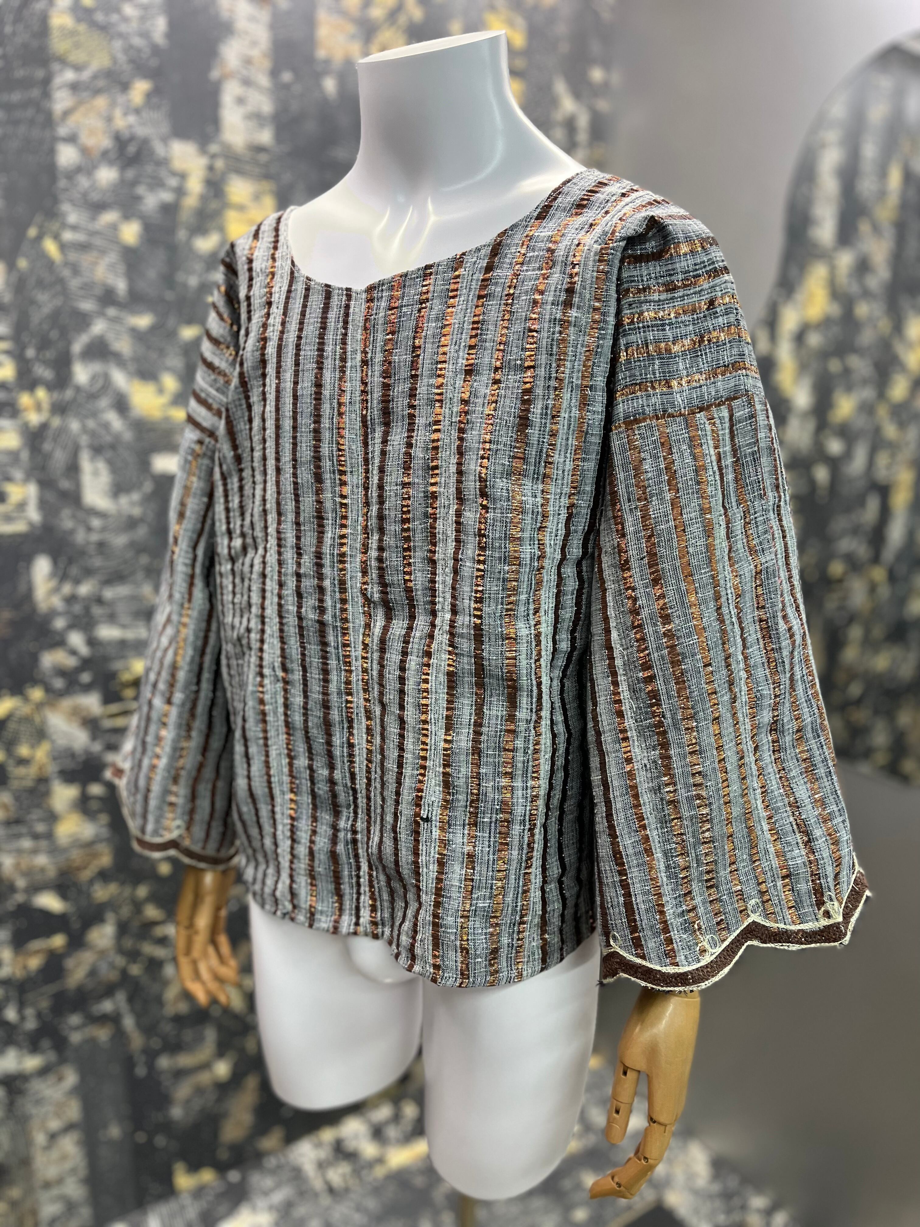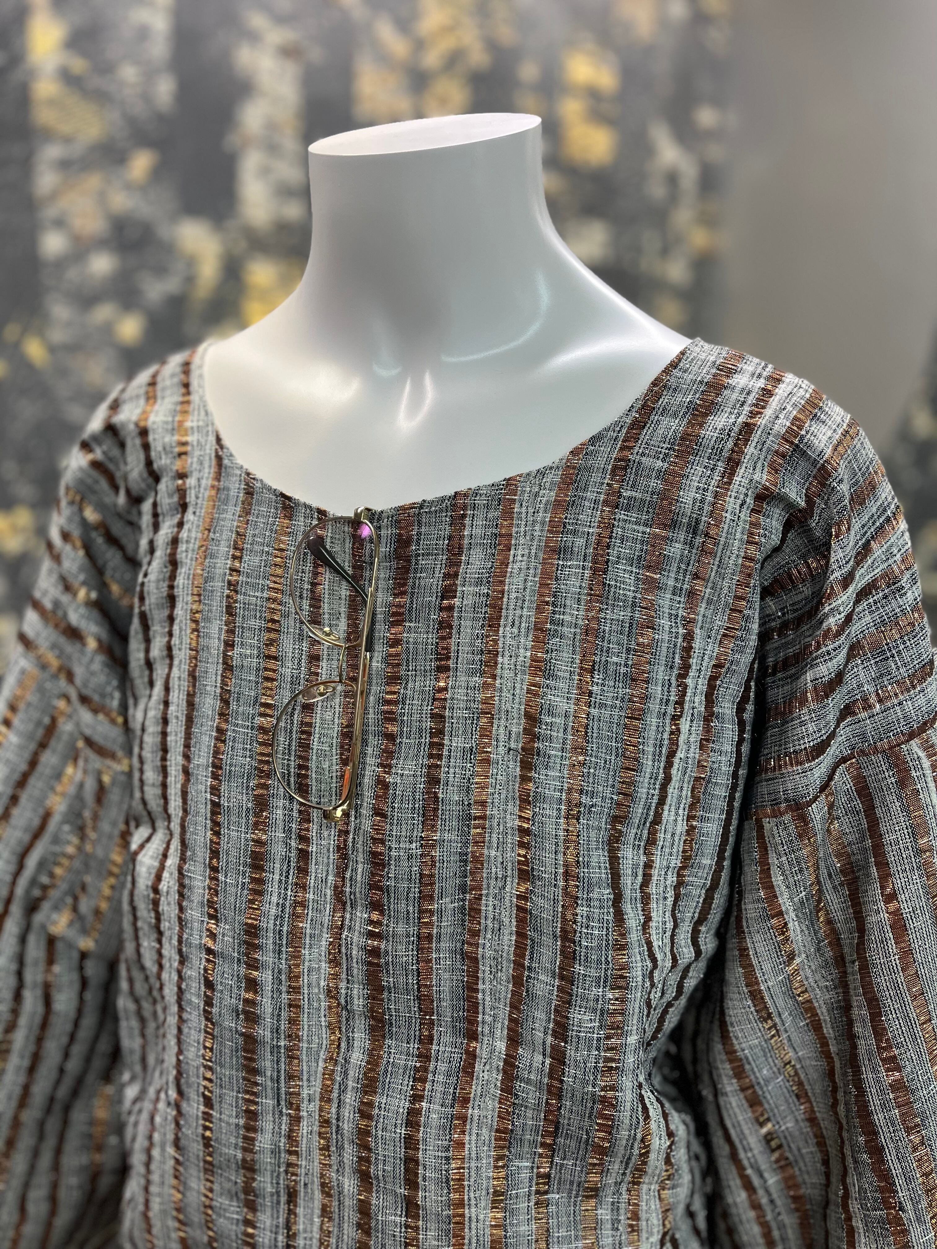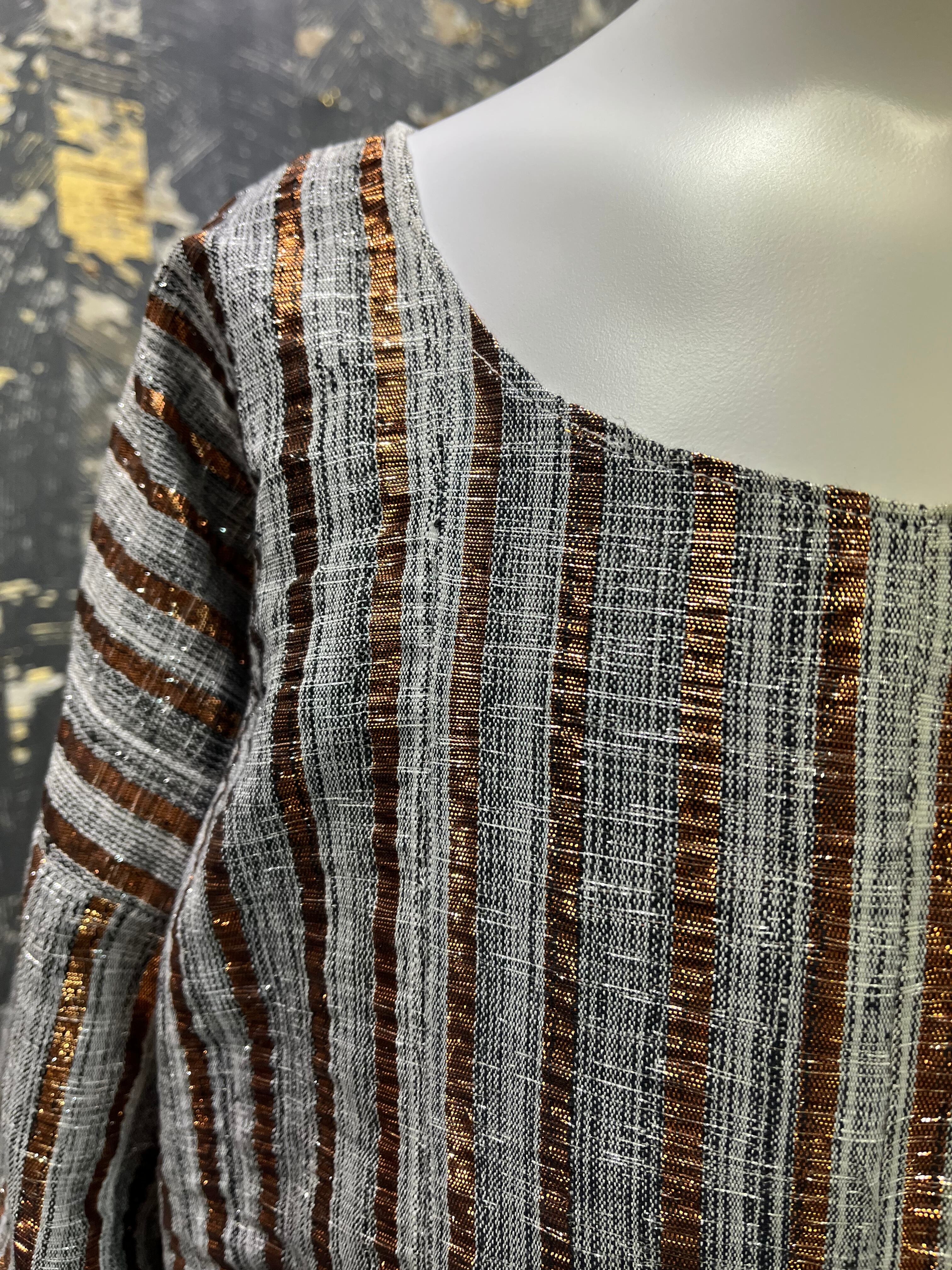民族衣装チュニックぽい形にラメブロンズ。